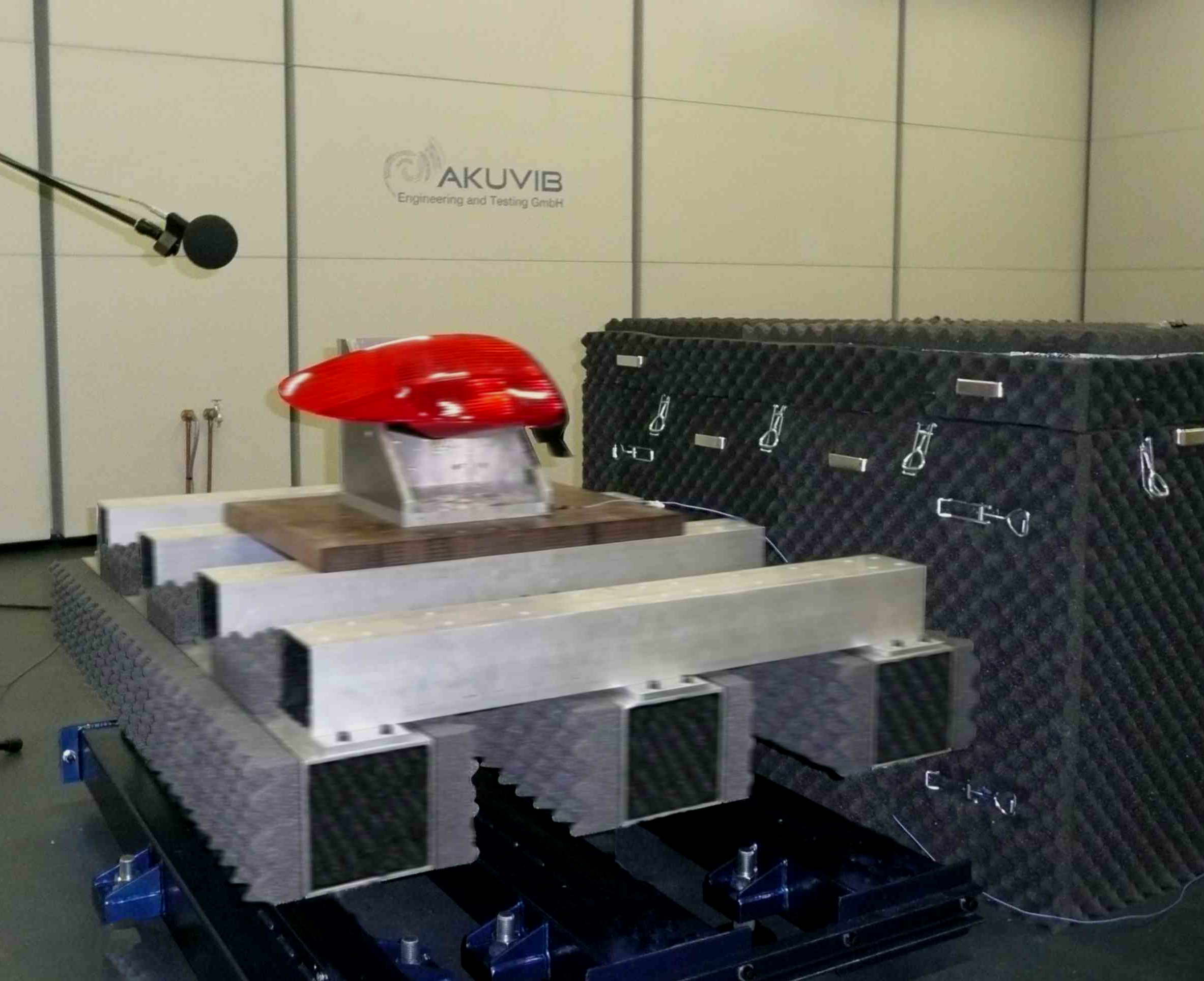 AKUVIB verwendet hierfür einen speziellen Shaker, der nahezu lautlos arbeitet. Die elektronischen und mechanischen Komponenten werden in Einbaulage auf spezielle Halterungen befestigt und dann fremderregt zu Schwingungen angeregt. In einem Halbfreifeldraum (NR<=20dB) können dann die Geräusche gemessen werden.